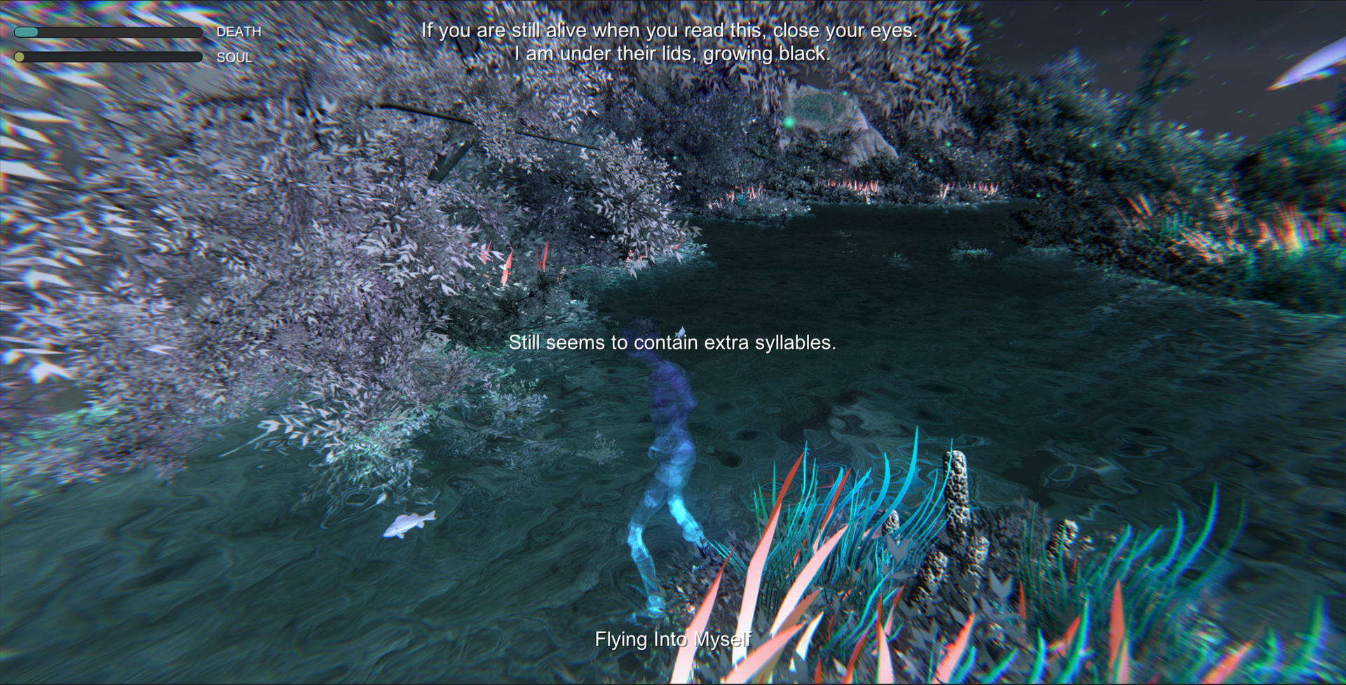 FLYING INTO MY SELF', which is a computer game, it describes a poetry space about death and lives. Pieces of fragile sentences in the game, which are distributed to each fishes, are originated from the poetries written by me near six years long. Audiences or players need to catch each fish met in the game and had a conversation with them and then reconstruct their own mentally poetry space.